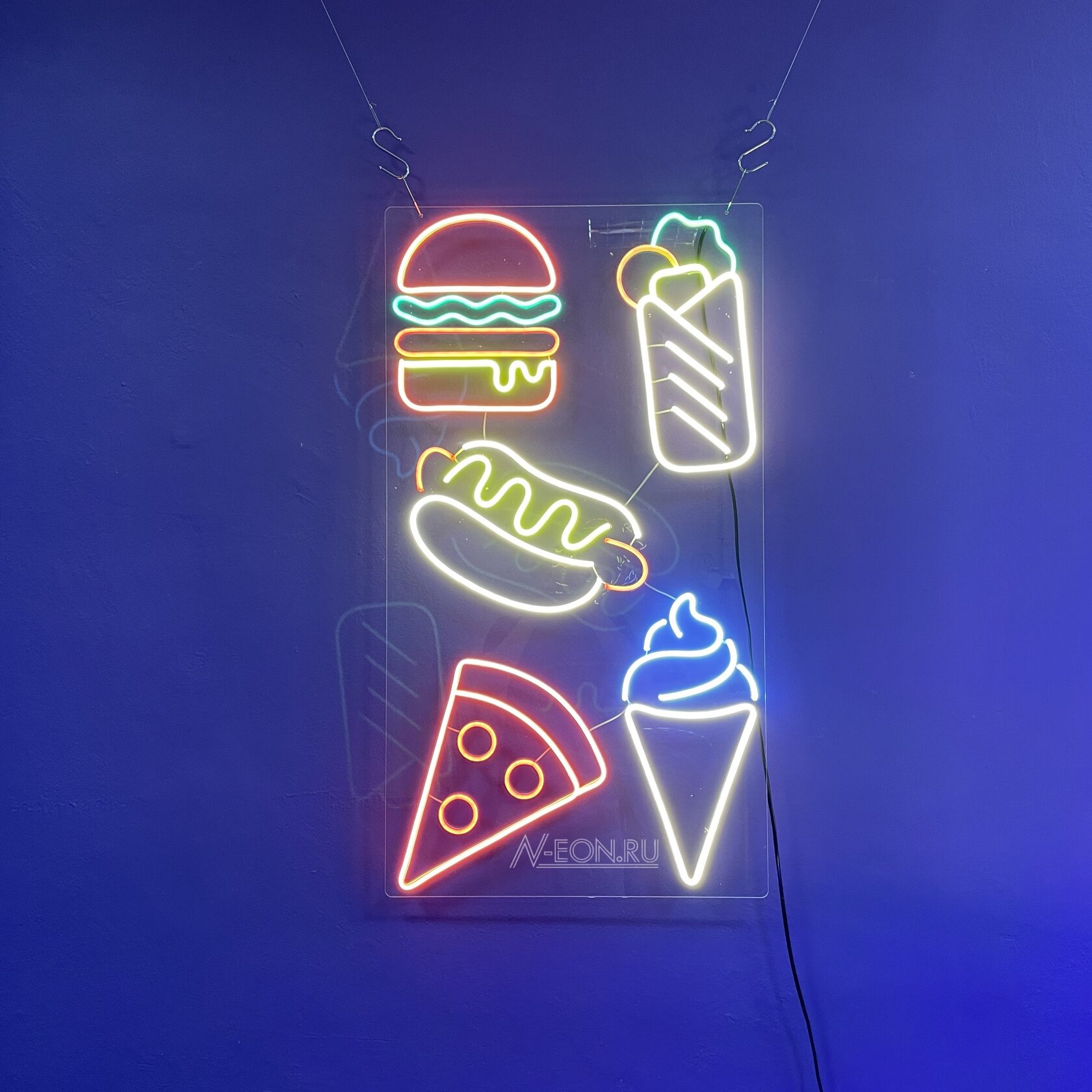 🌭 Неоновая вывеска "Еда фастфуд" станет ярким акцентом для бургерных, закусочных и фуд-кортов. Привлекайте клиентов аппетитным дизайном, который говорит сам за себя! 🍟✨