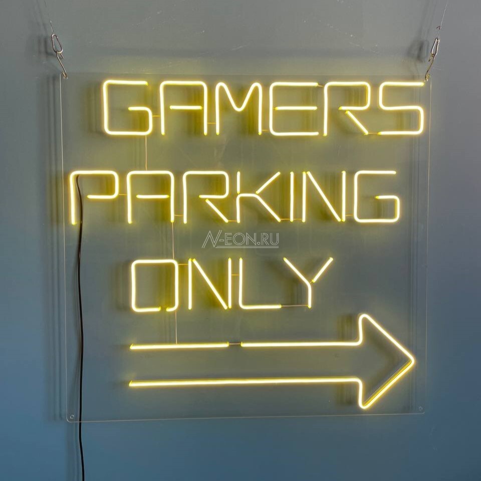 Для настоящих геймеров! Эта неоновая вывеска с акцентом подчеркнет любовь к играм. Надпись "Gamers parking only" со стрелкой вправо. Идеально для игровой комнаты или компьютерного клуба.
