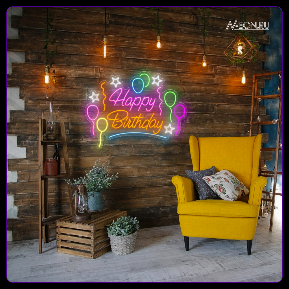 Неоновая вывеска Happy Birthday с воздушными шарами