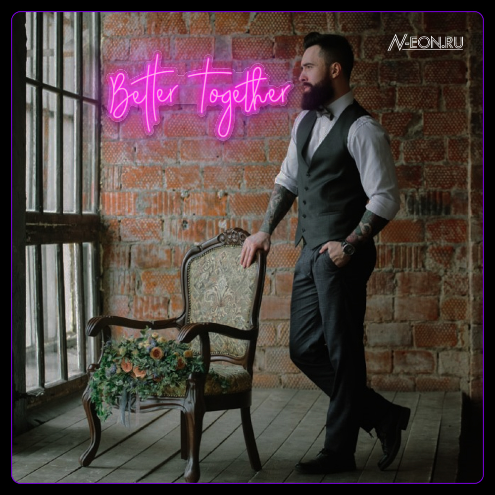 "Better Together" — это стильная неоновая вывеска, которая подчеркнет вашу историю любви. Ее мягкий свет и современный дизайн идеально подойдут для свадеб, годовщин или романтических вечеров.