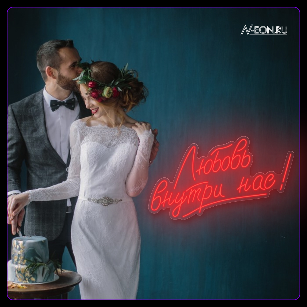 Неоновая вывеска "Любовь внутри нас!" — это трогательный элемент декора, который подчеркнет ваши чувства. Яркое свечение и современный дизайн идеально подойдут для свадеб, фотозон и романтических вечеров, создавая атмосферу любви и единства.