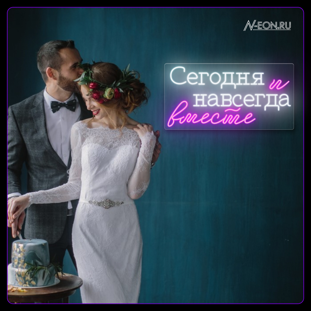 "Сегодня и навсегда вместе" — это не просто вывеска, а обещание любви и преданности. Ее изящный дизайн и теплое свечение создадут романтическую атмосферу на свадьбе или годовщине. Легкий монтаж и стильный вид делают ее универсальным декором.