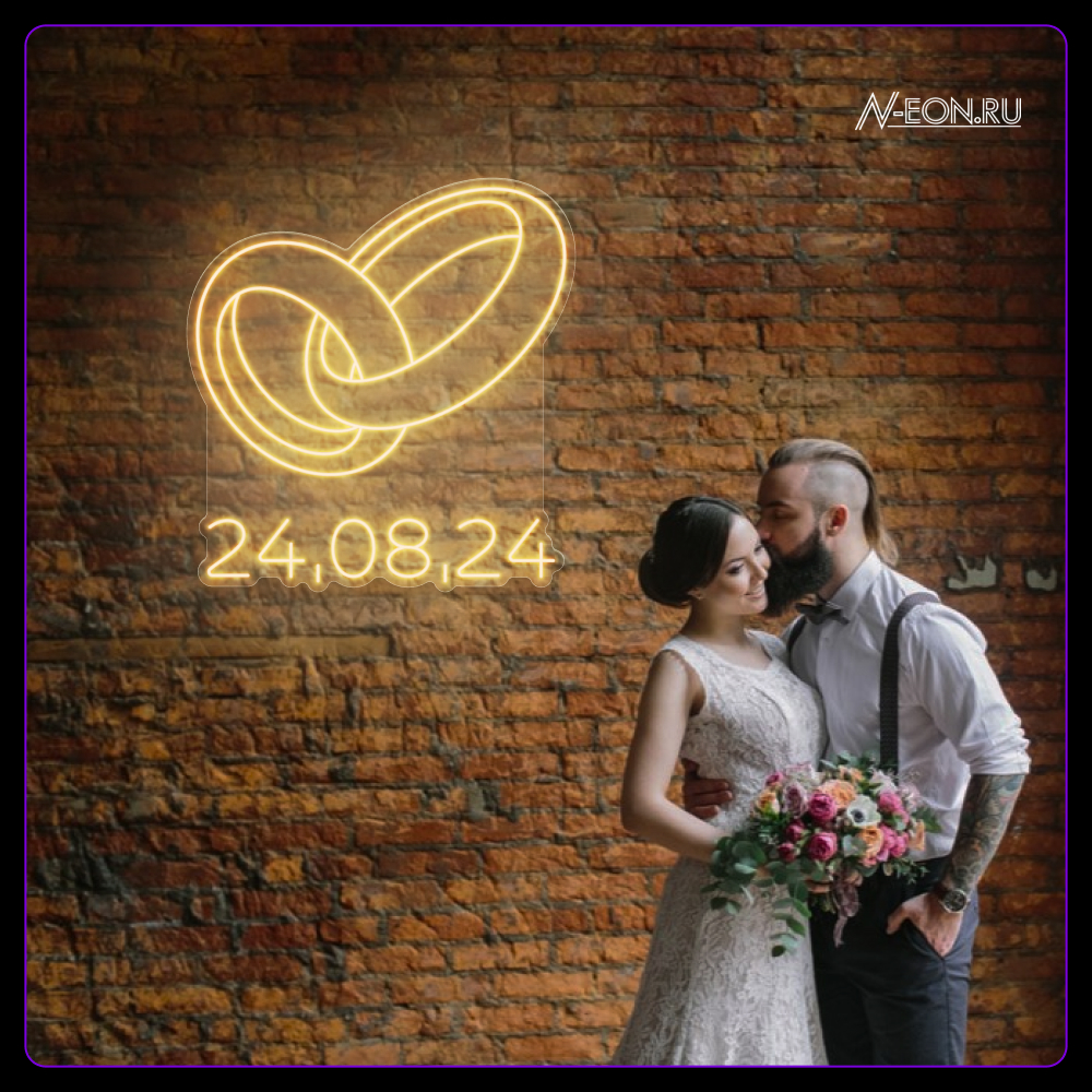 Неоновая вывеска "Свадебные кольца с датой" — это персонализированный элемент декора, который подчеркнет значимость вашего дня. Яркое свечение и стильный дизайн создадут романтическую атмосферу на свадьбе и годовщине.