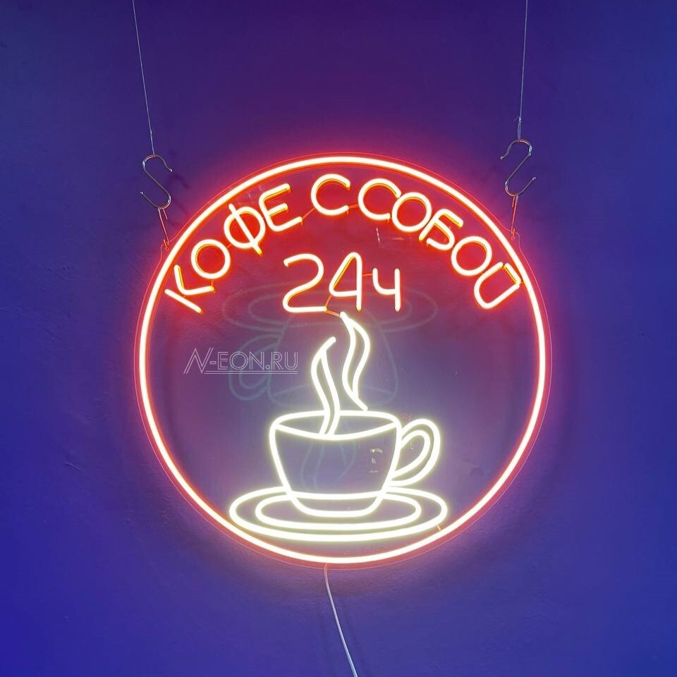 Вывески из гибкого светодиодного неона для кофеен: - легко устанавливаются и подключаются к сети 220 Вольт (через блок питания 12 Вольт) - имеют длительный срок эксплуатации - не теряют яркости и не выцветают со временем - не содержат газа - не требуют дополнительного обслуживания - экологически безопасны для человека и окружающей среды