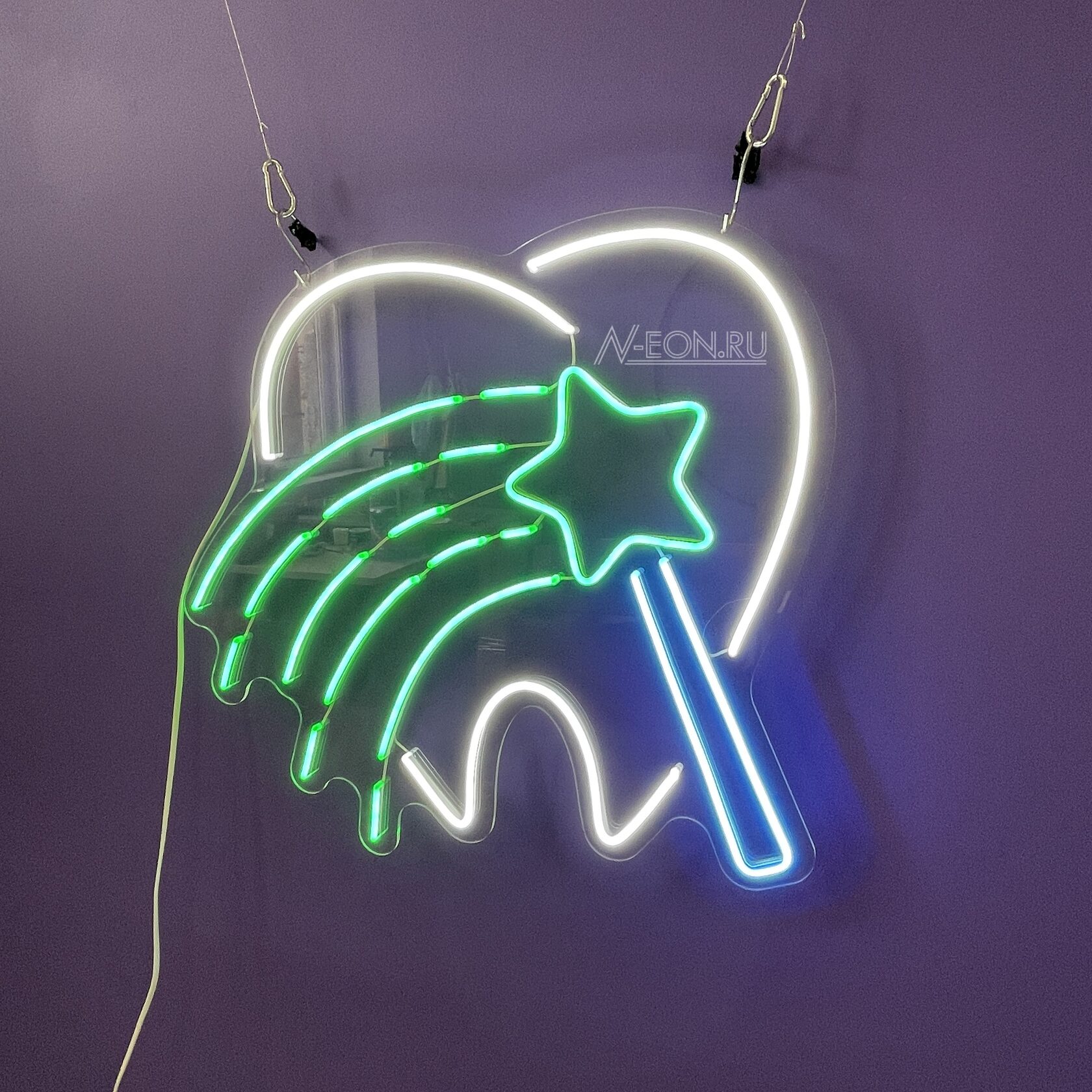 🦷 Неоновая вывеска "Зуб с волшебной палочкой" создаст волшебную атмосферу в вашей стоматологии. Она привлечет внимание взрослых и детей, подчеркивая, что здесь творят настоящие чудеса для зубов. Идеально для детских стоматологий или клиник с семейным подходом. 🌟 Неоновая вывеска зуб, стоматология, волшебная палочка, реклама клиники.